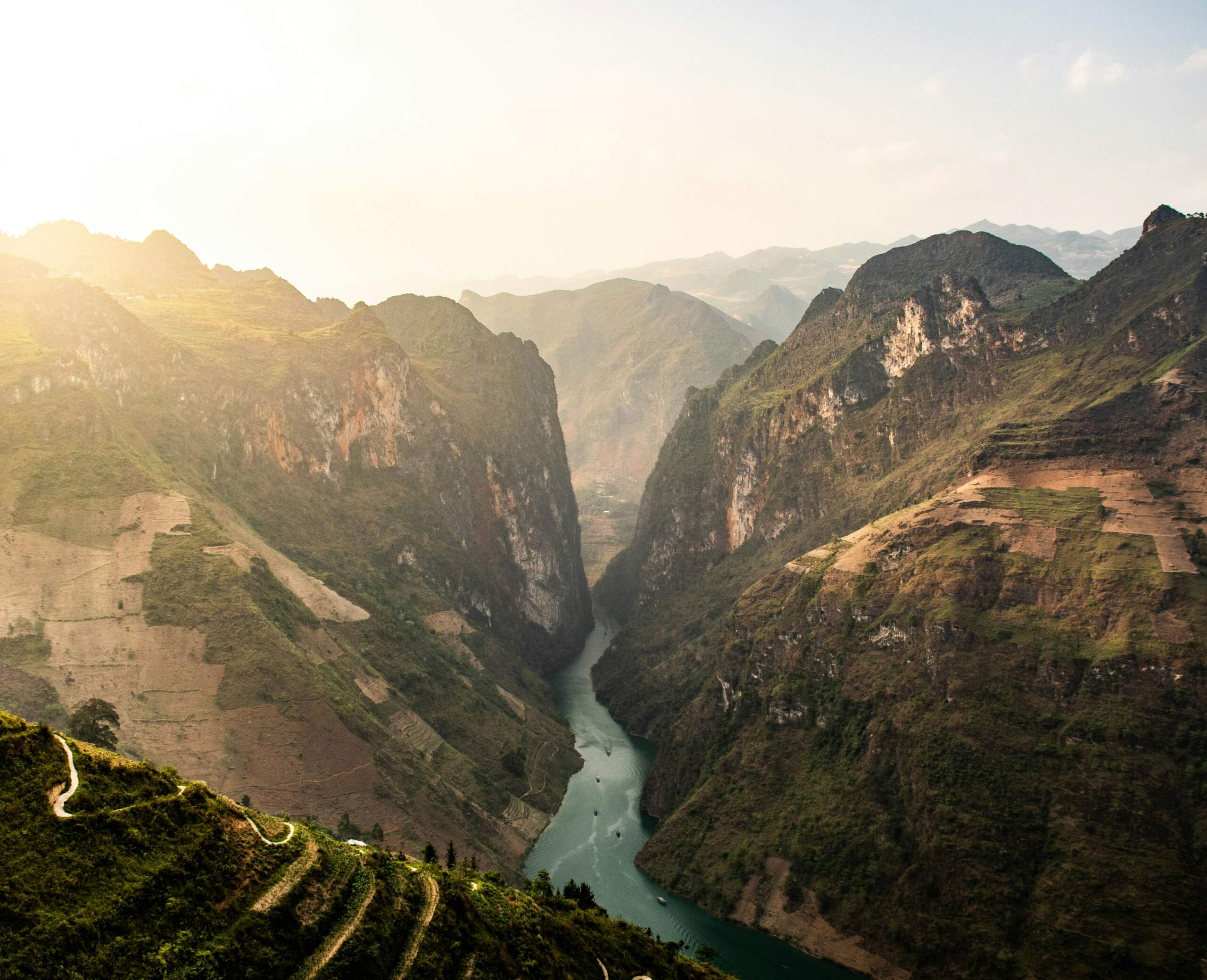 La provincia de Ha Giang es una sucesión de montañas kársticas, valles profundos y ríos como el Nho Que. La puerta del cielo de Quan Ba ofrecen vistas panorámicas inolvidables sobre las “colinas gemelas” y los pueblos del valle. Más adelante, el Ma Pi Leng Pass entre Dong Van y Meo Vac es considerado uno de los pasos de montaña más impresionantes del sudeste asiático.